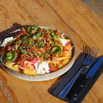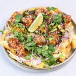 SWEET CHILLI z kurczakiempanierowane kurczaki w sosie sweet chilli, fryty w gochugaru i serze, grillowany ser mozarella, ogórek piklowany, jalapeno, cebula czerwona, kiełki, zest z pomarańczy, szczypior, sezam, sos aioli z pieczonego czosnku 400g