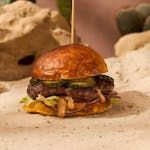PEANUT BUTTER BEKON DŻEMwołowina, bułka brioche, dżem z bekonu, mozarella x2, krążki cebulowe, ogórek piklowany, sałata, masło orzechowe 400g