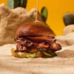 PULLED PORK HONEY HOISINpulled pork honey hoisin, bułka brioche, mimolette, boczek, ogórki piklowane, sałata, bbq, mayo 400g